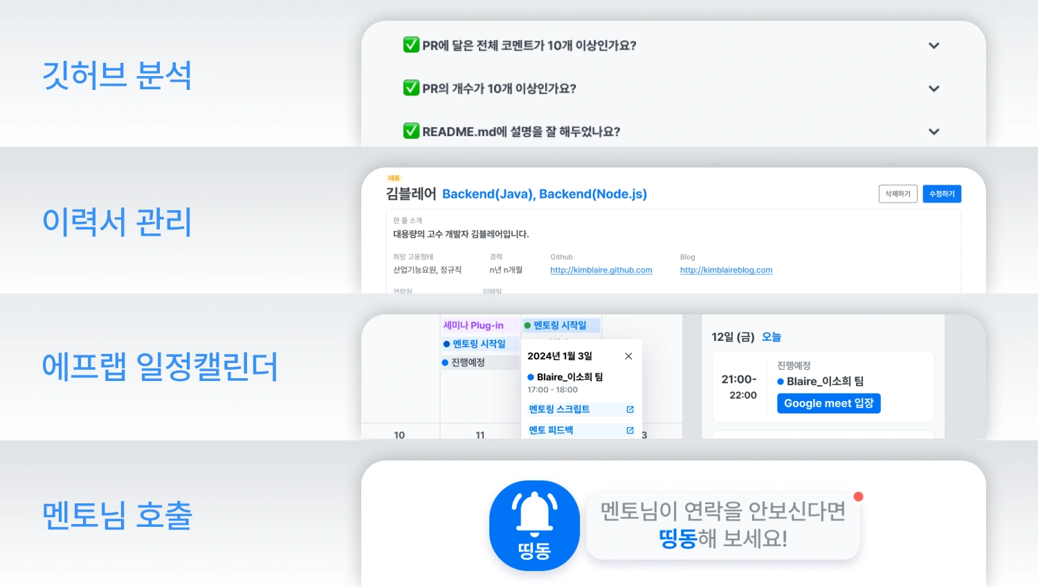 AI멘토, 멘토 호출, 깃허브 분석, 이력서 관리 등 학습공간을 지원