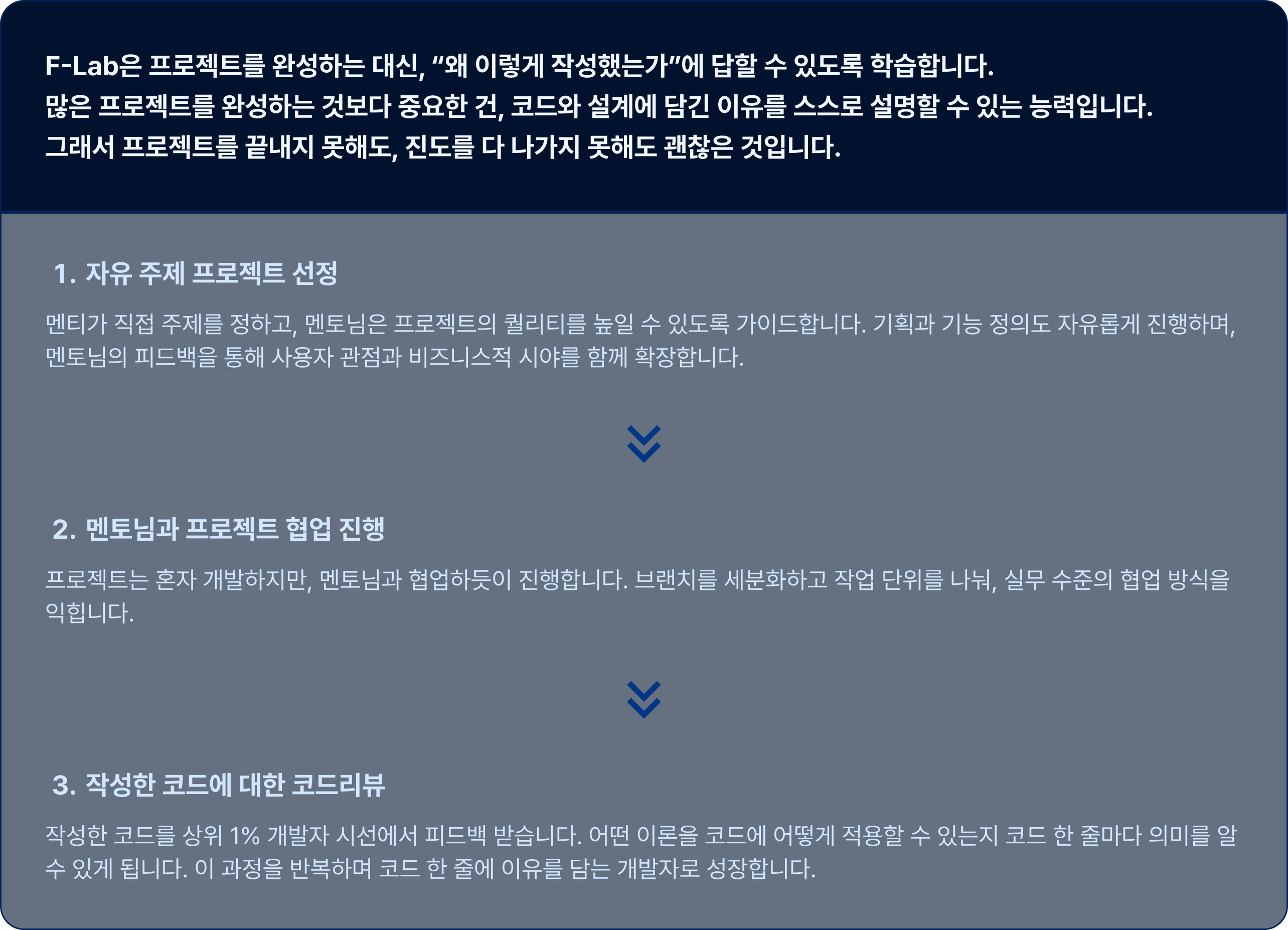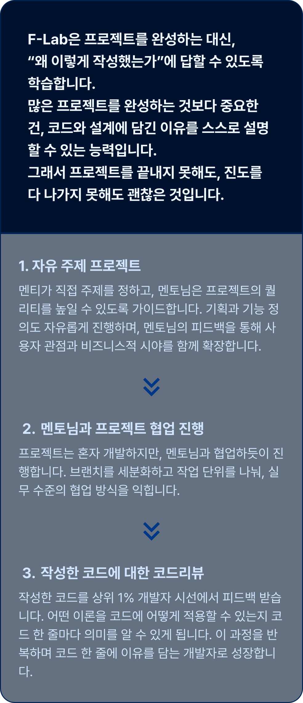 F-Lab은 어렵고 시간이 오래걸리더라도 자신이 학습했던 것들에 대해선 제대로 깊이있게 대답할 수 있도록 교육합니다. 그렇기에 프로젝트를 완성하지 못해도, 진도를 모두 나가지 못해도 괜찮습니다. 실제로 네카라쿠배에 합격한 F-Lab 수료생의 포트폴리오를 보면 완성된 프로젝트는 거의 없습니다.
